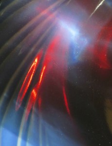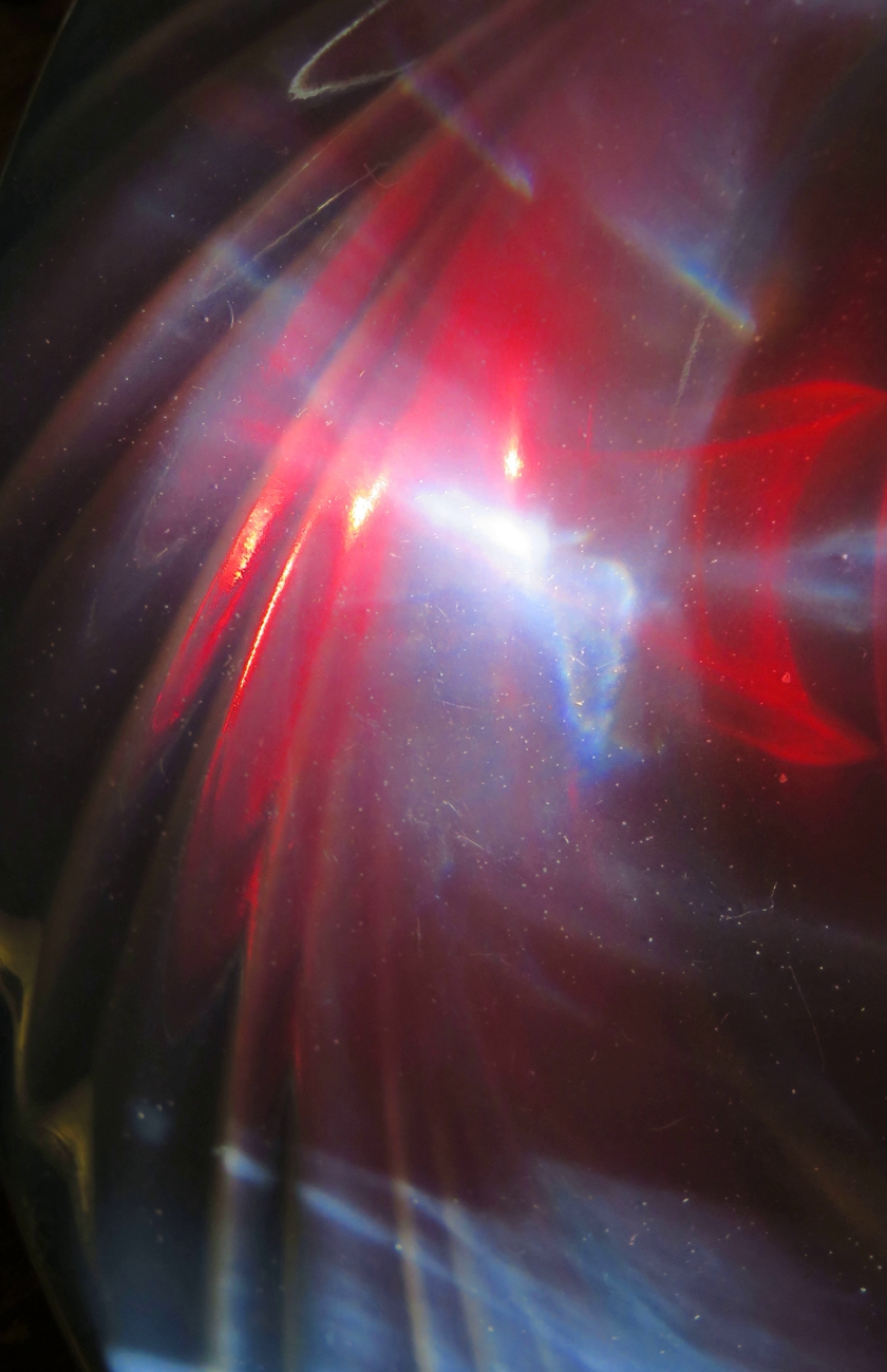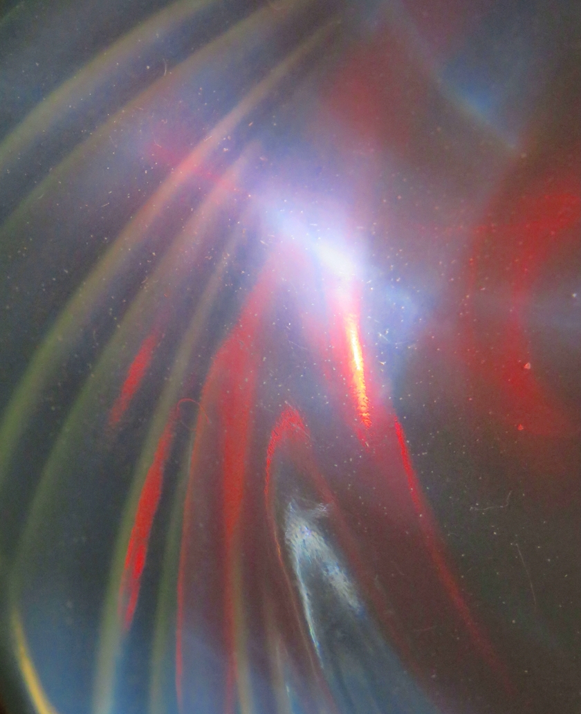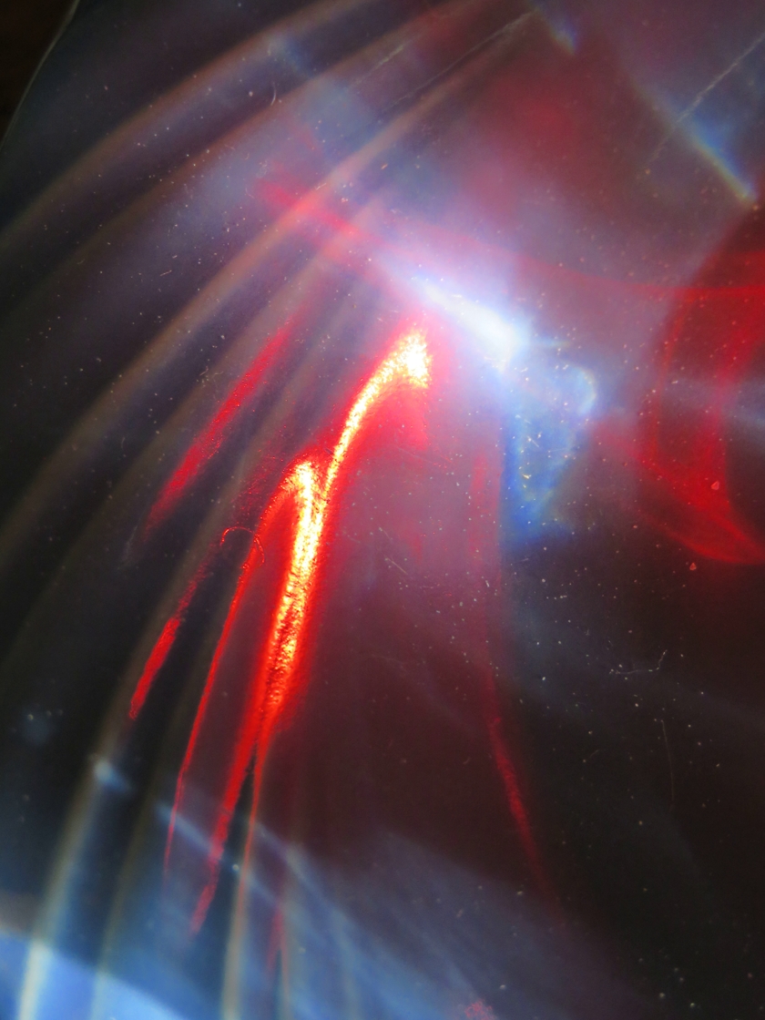 The shallow glass bowl of my birdbath was spending the winter as a decoration in the living room. While cleaning the room, I happened to set the bowl down under a window where sunlight could reflect from the bowl and then from the ceiling.